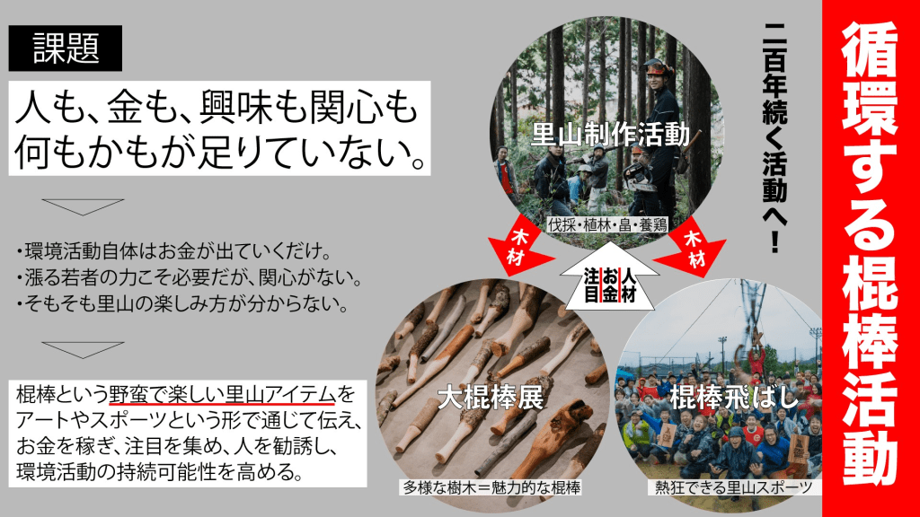 「棍棒」を起点にすれば、この問題を楽しみながら恢復に導くための循環が生まれます。より多くの人々を熱狂に巻き込み、一緒に歓びを共有しながら、継続的に里山を守っていくことが可能になるのです。